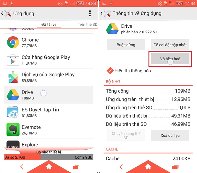 Để thực hiện việc đó, bạn vào phần Cài đặt và kéo sang phải đến mục Tất cả (mục cuối cùng) rồi lựa chọn ứng dụng muốn tắt và chạm vào nút Tắt (hoặc Vô hiệu hóa), sau khi tắt, ứng dụng sẽ được loại bỏ khỏi app drawer, hệ thống cũng sẽ xóa bỏ dữ liệu người dùng của nó nên bạn có thể yên tâm. Trong trường hợp nếu muốn bật lại, bạn cùng thực hiện thao tác tương tự.