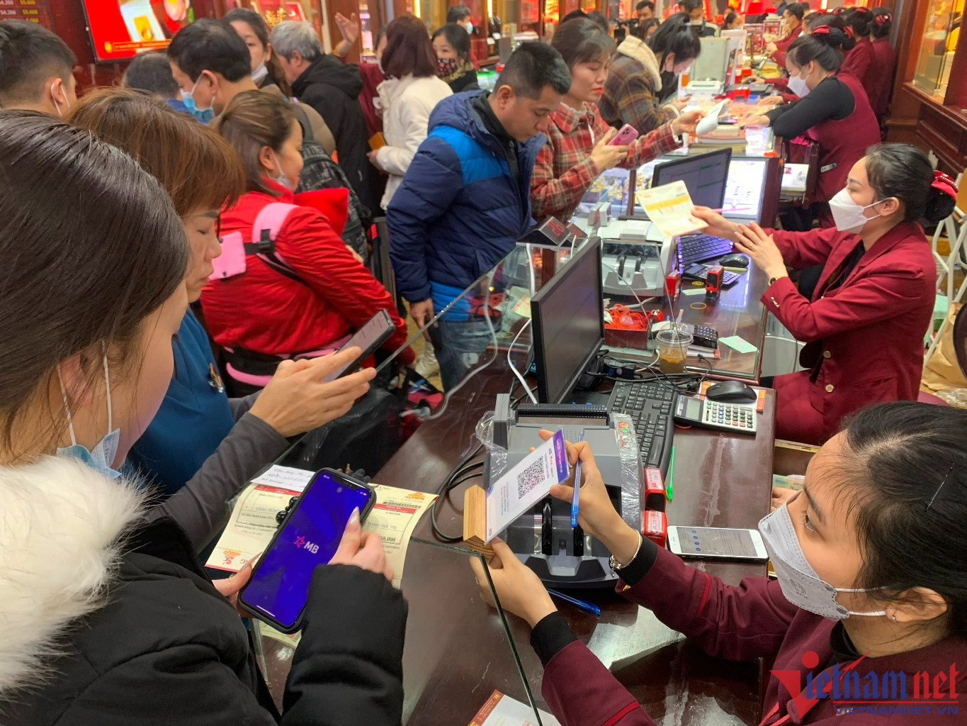 Một nhân viên thu ngân tại hiệu vàng Bảo Tín Minh Châu trên phố Trần Nhân Tông cho biết, từ sáng sớm đến trưa nay, lượng khách đến mua vàng và thanh toán bằng hình thức chuyển khoản nhiều hơn lượng khách thanh toán bằng tiền mặt.