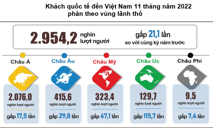 Tính chung 11 tháng năm 2022, khách quốc tế đến nước ta đạt 2,954 triệu lượt người, gấp 21,1 lần so với cùng kỳ năm trước nhưng vẫn giảm 81,9% so với cùng kỳ năm 2019 - thời điểm chưa xảy ra dịch Covid-19.