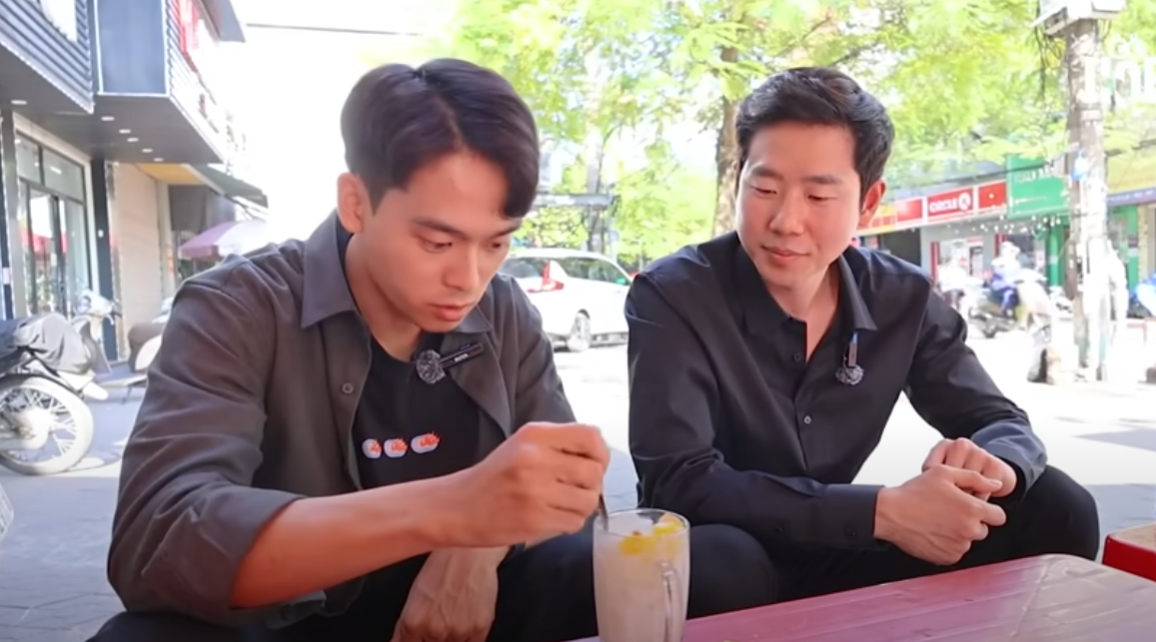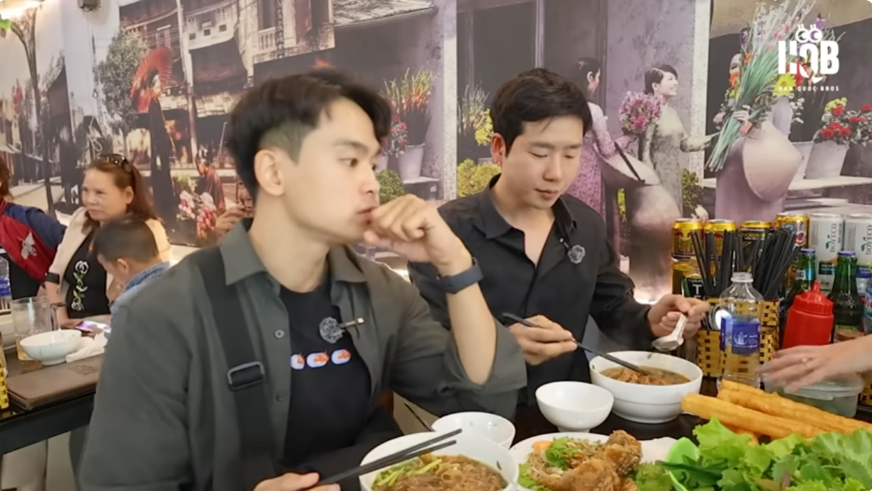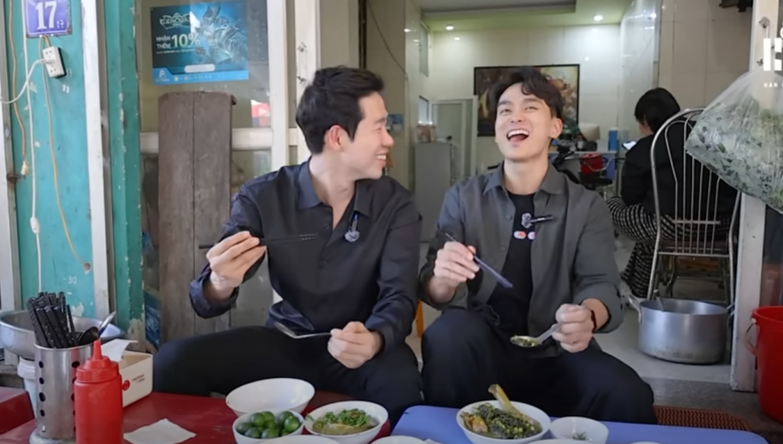 Hai chàng trai Hàn Quốc hào hứng thưởng thức nhiều món ngon trong chuyến foodtour Hải Phòng (Ảnh chụp màn hình)