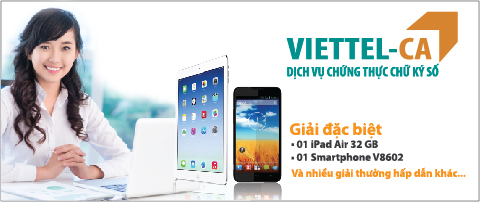 Theo đó, các khách hàng là doanh nghiệp đăng ký mới, gia hạn, chuyển đổi nhà cung cấp dịch vụ Viettel - CA sẽ có cơ hội nhận các giải thưởng hấp dẫn như: Giải đặc biệt iPad Air 32GB và điện thoại điện thoại Viettel V8602 (đây là điện thoại smartphone với màn hình cảm ứng rộng lên tới 5 inches) có tổng trị giá 21.340.000đ, 02 giải Nhất mỗi giải là một số điện thoại đẹp của Viettel (số tứ quý 7777 hoặc 6868 đầu 10 số) và điện thoại Viettel V8602 có tổng giá trị 12.350.000 đồng/giải, 05 giải Nhì là những cặp điện thoại Smartphone Viettel V8602 và V8403 có tổng giá trị 4.250.000 đồng/giải, 05 giải Ba là cặp điện thoại Viettel V8506 và Viettel Sumo V6202 có tổng giá trị 2.685.000 đồng/giải.