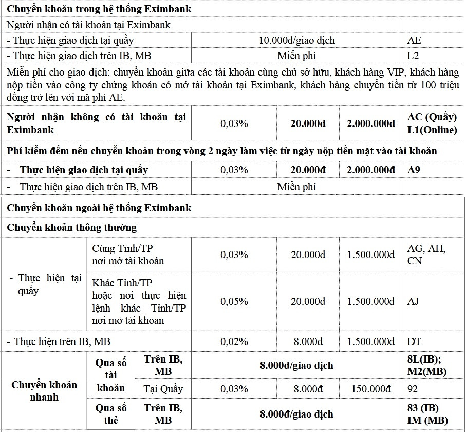 Đối với giao dịch chuyển tiền ngoài hệ thống Eximbank, phí giao dịch tại quầy là 0,03%, tối thiểu 20.000 đồng và tối đa 1,5 triệu đồng (cùng tỉnh/thành phố); mức phí 0,05%, tối thiểu 20.000 đồng và tối đa 1,5 triệu đồng (khác tỉnh/thành phố).