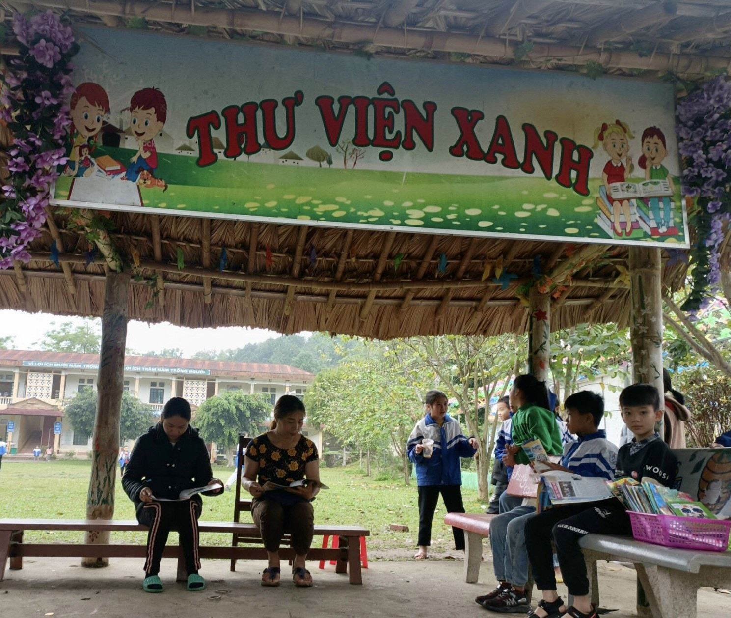 Thầy hiệu trưởng Đặng Xuân Khu cho biết, từ năm 2014, một thư viện nhỏ đã được thành lập với số lượng và đầu sách khiêm tốn. Xuất phát từ ước muốn đưa sách đến với trẻ em quanh vùng, các thầy cô ở Bình Trung còn làm một “thư viện xanh” theo mô hình phòng chờ ngay sát cổng trường.