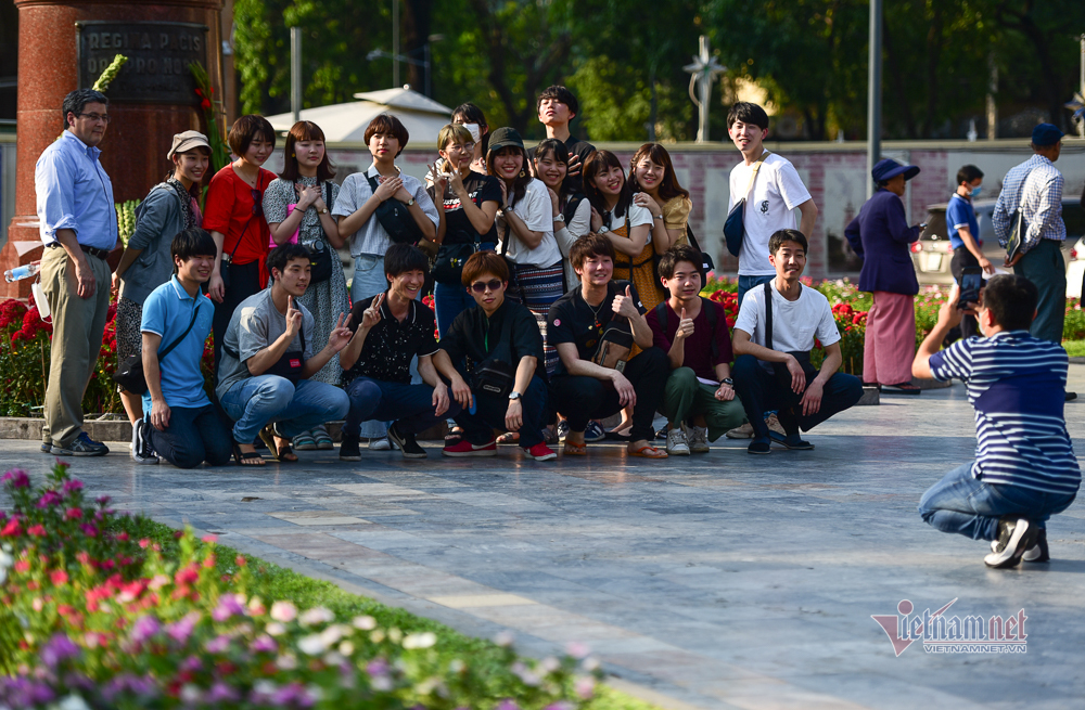 Nụ cười tươi trên môi nhóm du khách Hàn Quốc khi chụp ảnh trước Nhà thờ Đức Bà, quận 1