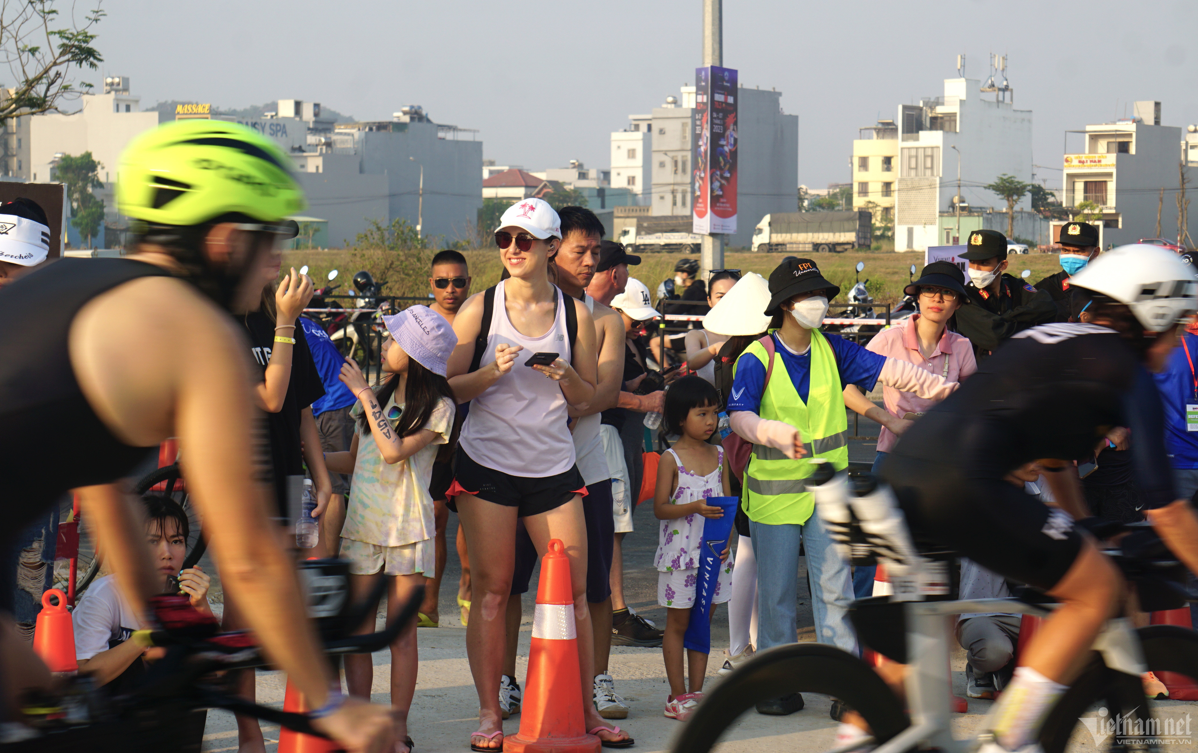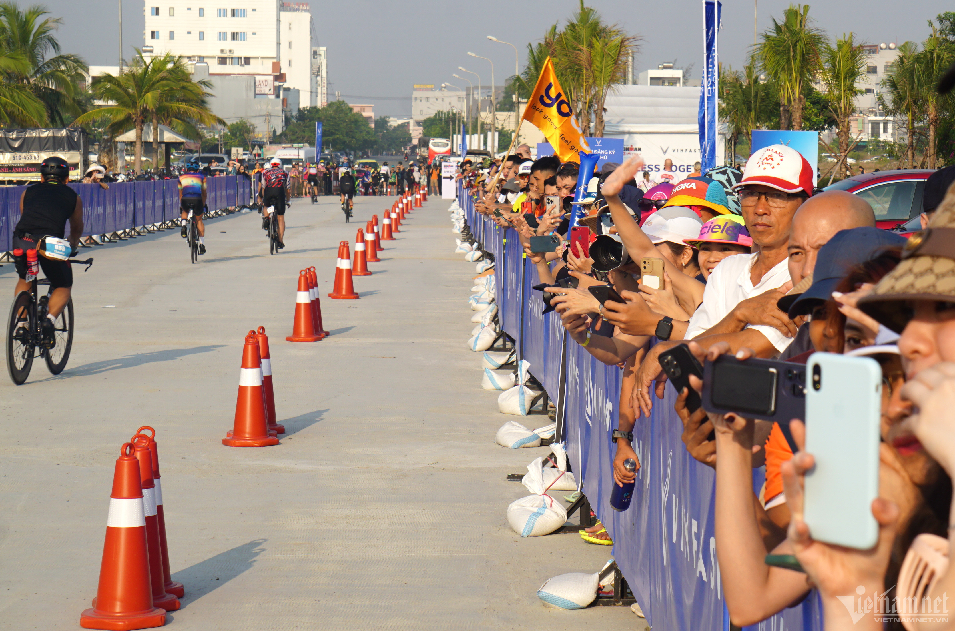 Đông đảo người dân và du khách có mặt dọc tuyến đường biển ở Đà Nẵng theo dõi, cổ vũ cho các vận động viên tham gia cuộc đua 3 môn phối hợp Ironman 70.3 Việt Nam.