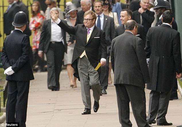 Ca sỹ Elton John vẫy tay chào đám đông đang tụ tập trước tu viện Westminster.