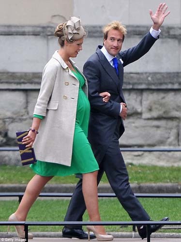 MC truyền hình Ben Fogle trông rất bảnh bao với bộ comple và cà-vạt xanh, đi cùng anh là người vợ đang mang bầu Maria trong bộ váy xanh ngọc bích với áo khoác và mũ màu be.