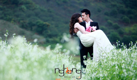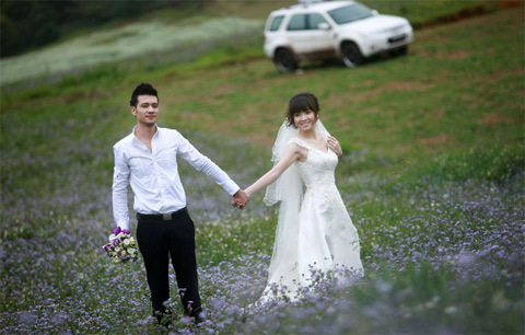 Khải Anh tự lái chiếc ô tô màu trắng (ở phía xa) cùng vợ lên Mộc Châu chụp ảnh cưới
