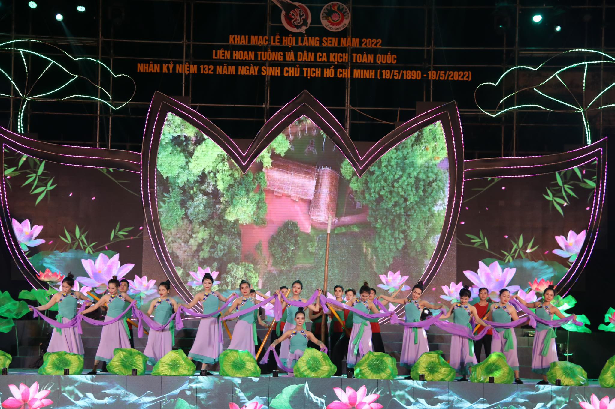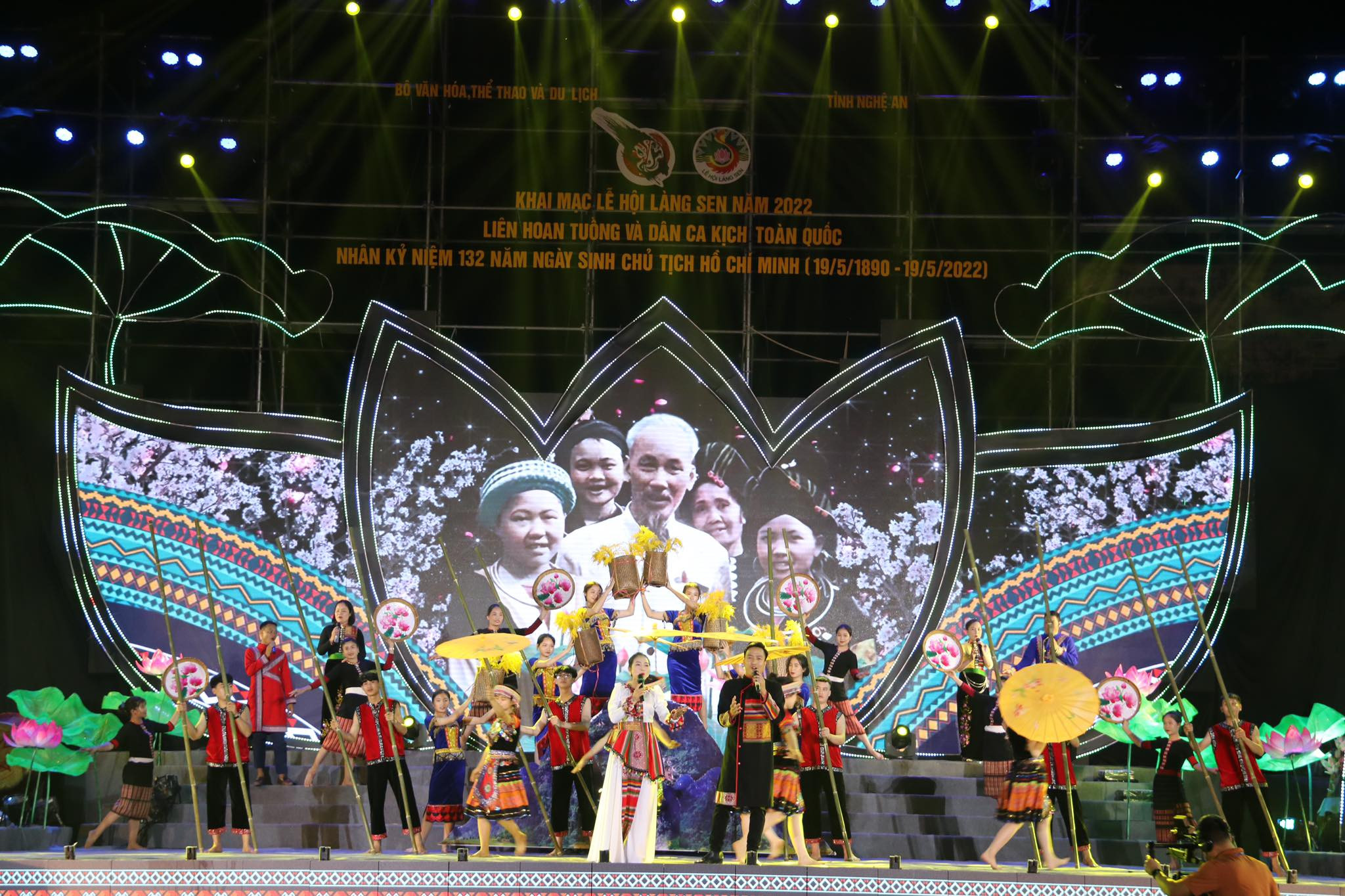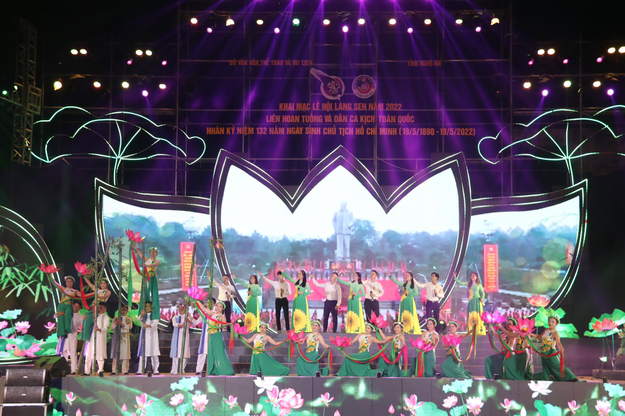 Tối 17/5, tại SVĐ Làng Sen, Khu di tích Quốc gia đặc biệt Kim Liên, huyện Nam Đàn, Nghệ An, Bộ Văn hóa, Thể thao và Du lịch phối hợp UBND tỉnh Nghệ An tổ chức khai mạc “Lễ hội Làng Sen và Liên hoan Tuồng, Dân ca kịch toàn quốc 2022” nhân dịp kỷ niệm 132 năm Ngày sinh Chủ tịch Hồ Chí Minh (19/5/1890 - 19/5/2022).Phát biểu tại Lễ khai mạc, Thứ trưởng Bộ Văn hóa, Thể thao và Du lịch Tạ Quang Đông khẳng định, hoà chung dòng chảy Lễ hội Làng Sen, Liên hoan Tuồng và Dân ca kịch toàn quốc - 2022 được tổ chức trên quê hương Nghệ An vào dịp sinh nhật Bác là hoạt động mang ý nghĩa sâu sắc của các văn nghệ sĩ nói chung, đồng bào, nhân dân tỉnh Nghệ An nói riêng dâng lên Chủ tịch Hồ Chí Minh khúc dân cả của mọi miền Tổ quốc.Chương trình lễ khai mạc gồm 3 phần: Phần 1 - Khai hội bằng màn hát múa “Hát về Người Hồ Chí Minh” và diễu hành của các đoàn Nghệ thuật quần chúng, đoàn nghệ thuật chuyên nghiệp; Phần 2 - Lễ khai mạc và đánh trống khai mạc; Phần 3 - Chương trình nghệ thuật “Người là niềm tin tất thắng”.“Lễ hội Làng Sen năm 2022” gồm có 5 hoạt động phần lễ, gồm: Lễ dâng hoa trước Tượng đài Bác Hồ tại Quảng trường Hồ Chí Minh; lễ dâng hoa, dâng hương tại Nhà tưởng niệm Chủ tịch Hồ Chí Minh và Đền Chung Sơn; lễ rước ảnh Bác Hồ từ nhà Tưởng niệm Chủ tịch Hồ Chí Minh tại Khu di tích quốc gia đặc biệt Kim Liên ra sân vận động Làng Sen; lễ khai mạc Lễ hội Làng Sen và Liên hoan “Tuồng và Dân ca kịch toàn quốc năm 2022”, tổng kết Lễ hội tại Quảng trường Hồ Chí Minh.Bên cạnh đó còn có 6 hoạt động hội, gồm Liên hoan Tuồng và Dân ca kịch toàn quốc năm 2022; liên hoan nghệ thuật quần chúng Tiếng hát Làng Sen; cuộc thi “Sắc Sen xứ Nghệ”; chương trình nghệ thuật “Người Mẹ Làng Sen”; tổ chức trưng bày chuyên đề ảnh về Bác Hồ; cuộc thi ảnh Online “Hello Nam Đàn”; tổ chức trưng bày, giới thiệu văn hóa ẩm thực, các sản phẩm đặc sắc của tỉnh Nghệ An.“Liên hoan Tuồng, Dân ca kịch toàn quốc năm 2022” là cơ hội để các nghệ sĩ thể hiện sự đam mê nghề nghiệp, thể hiện tài năng. Bên cạnh đó, lễ hội cũng là dịp để giới thiệu đến nhân dân Nghệ An và du khách các di sản nghệ thuật truyền thống đặc sắc của các vùng, miền trên toàn quốc khi đến với Lễ hội Làng Sen nhân dịp kỷ niệm 132 năm Ngày sinh của Chủ tịch Hồ Chí Minh”, đồng chí Tạ Quang Đông nhận định.Sau nhiều năm hình thành và phát triển, lễ hội Làng Sen đã trở thành ngày hội lớn của người dân xứ Nghệ và cả nước. Qua đó, tạo điều kiện cho người dân hưởng thụ và sáng tạo các giá trị văn hóa; góp phần đẩy mạnh phong trào học tập và làm theo tư tưởng, đạo đức, phong cách Hồ Chí Minh, xây dựng văn hóa, con người Việt Nam đáp ứng yêu cầu phát triển bền vững của đất nước.Năm 2020, do ảnh hưởng của dịch Covid-19, Lễ hội Làng Sen quy mô cấp quốc gia đã phải rút gọn nhiều hoạt động trong phần lễ và phần hội.Chương trình nghệ thuật "Người là niềm tin tất thắng" được dàn dựng công phu với sự tham gia biểu diễn của hơn 500 nghệ sĩ từ các đoàn nghệ thuật.