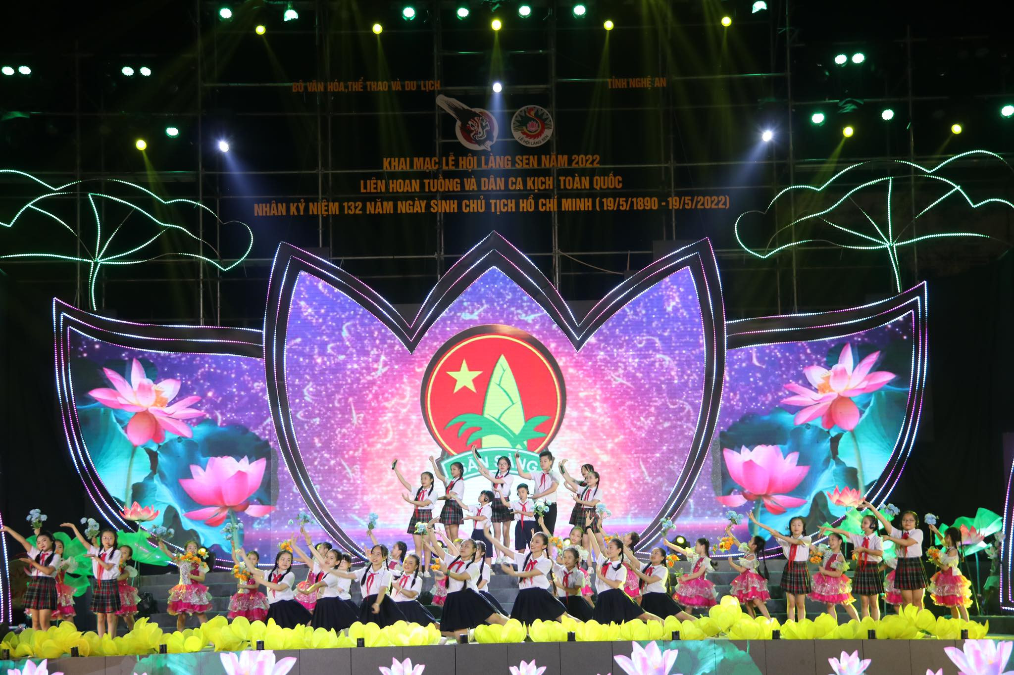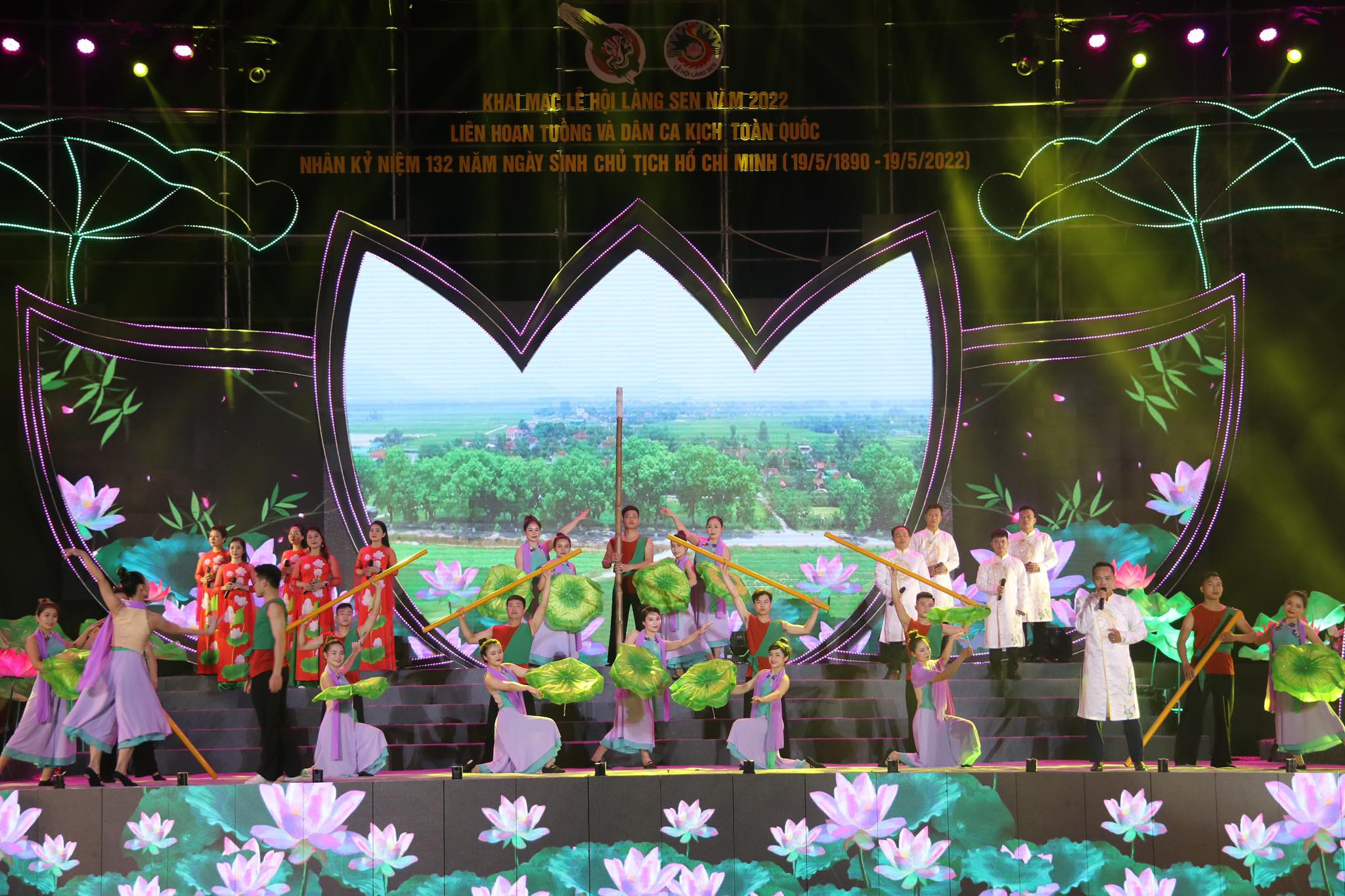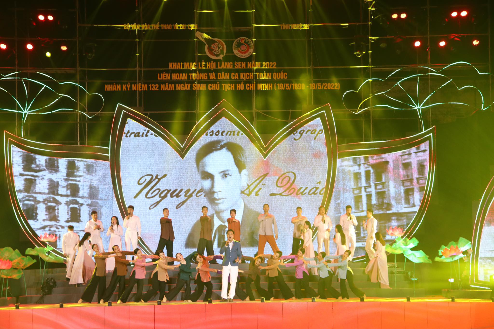 Tối 17/5, tại SVĐ Làng Sen, Khu di tích Quốc gia đặc biệt Kim Liên, huyện Nam Đàn, Nghệ An, Bộ Văn hóa, Thể thao và Du lịch phối hợp UBND tỉnh Nghệ An tổ chức khai mạc “Lễ hội Làng Sen và Liên hoan Tuồng, Dân ca kịch toàn quốc 2022” nhân dịp kỷ niệm 132 năm Ngày sinh Chủ tịch Hồ Chí Minh (19/5/1890 - 19/5/2022).Phát biểu tại Lễ khai mạc, Thứ trưởng Bộ Văn hóa, Thể thao và Du lịch Tạ Quang Đông khẳng định, hoà chung dòng chảy Lễ hội Làng Sen, Liên hoan Tuồng và Dân ca kịch toàn quốc - 2022 được tổ chức trên quê hương Nghệ An vào dịp sinh nhật Bác là hoạt động mang ý nghĩa sâu sắc của các văn nghệ sĩ nói chung, đồng bào, nhân dân tỉnh Nghệ An nói riêng dâng lên Chủ tịch Hồ Chí Minh khúc dân cả của mọi miền Tổ quốc.Chương trình lễ khai mạc gồm 3 phần: Phần 1 - Khai hội bằng màn hát múa “Hát về Người Hồ Chí Minh” và diễu hành của các đoàn Nghệ thuật quần chúng, đoàn nghệ thuật chuyên nghiệp; Phần 2 - Lễ khai mạc và đánh trống khai mạc; Phần 3 - Chương trình nghệ thuật “Người là niềm tin tất thắng”.“Lễ hội Làng Sen năm 2022” gồm có 5 hoạt động phần lễ, gồm: Lễ dâng hoa trước Tượng đài Bác Hồ tại Quảng trường Hồ Chí Minh; lễ dâng hoa, dâng hương tại Nhà tưởng niệm Chủ tịch Hồ Chí Minh và Đền Chung Sơn; lễ rước ảnh Bác Hồ từ nhà Tưởng niệm Chủ tịch Hồ Chí Minh tại Khu di tích quốc gia đặc biệt Kim Liên ra sân vận động Làng Sen; lễ khai mạc Lễ hội Làng Sen và Liên hoan “Tuồng và Dân ca kịch toàn quốc năm 2022”, tổng kết Lễ hội tại Quảng trường Hồ Chí Minh.Bên cạnh đó còn có 6 hoạt động hội, gồm Liên hoan Tuồng và Dân ca kịch toàn quốc năm 2022; liên hoan nghệ thuật quần chúng Tiếng hát Làng Sen; cuộc thi “Sắc Sen xứ Nghệ”; chương trình nghệ thuật “Người Mẹ Làng Sen”; tổ chức trưng bày chuyên đề ảnh về Bác Hồ; cuộc thi ảnh Online “Hello Nam Đàn”; tổ chức trưng bày, giới thiệu văn hóa ẩm thực, các sản phẩm đặc sắc của tỉnh Nghệ An.“Liên hoan Tuồng, Dân ca kịch toàn quốc năm 2022” là cơ hội để các nghệ sĩ thể hiện sự đam mê nghề nghiệp, thể hiện tài năng. Bên cạnh đó, lễ hội cũng là dịp để giới thiệu đến nhân dân Nghệ An và du khách các di sản nghệ thuật truyền thống đặc sắc của các vùng, miền trên toàn quốc khi đến với Lễ hội Làng Sen nhân dịp kỷ niệm 132 năm Ngày sinh của Chủ tịch Hồ Chí Minh”, đồng chí Tạ Quang Đông nhận định.Sau nhiều năm hình thành và phát triển, lễ hội Làng Sen đã trở thành ngày hội lớn của người dân xứ Nghệ và cả nước. Qua đó, tạo điều kiện cho người dân hưởng thụ và sáng tạo các giá trị văn hóa; góp phần đẩy mạnh phong trào học tập và làm theo tư tưởng, đạo đức, phong cách Hồ Chí Minh, xây dựng văn hóa, con người Việt Nam đáp ứng yêu cầu phát triển bền vững của đất nước.Năm 2020, do ảnh hưởng của dịch Covid-19, Lễ hội Làng Sen quy mô cấp quốc gia đã phải rút gọn nhiều hoạt động trong phần lễ và phần hội.Chương trình nghệ thuật "Người là niềm tin tất thắng" được dàn dựng công phu với sự tham gia biểu diễn của hơn 500 nghệ sĩ từ các đoàn nghệ thuật.