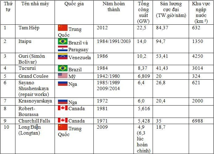 10 nhà máy thuỷ điện lớn nhất được sắp xếp theo thứ bậc công suất (đơn vị Giga-oat GW, 1GW= 1.000MW) trong bảng phía dưới đây.