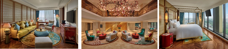 Bên cạnh lối kiến trúc độc đáo, khách sạn còn mang tới sự lựa chọn đa dạng với 181 phòng nghỉ. Từ phòng Deluxe 27m2 với thiết kế sang trọng trang nhã, cho đến phòng Tổng thống 116m2 với nội thất tinh tế, đẳng cấp và tiện nghi hiện đại bao gồm TV thông minh 50 inch, wifi tốc độ cao, máy pha cà phê và buồng tắm đứng. Các hạng phòng cao cấp bao gồm 11 phòng suite với phòng khách riêng biệt và Executive Lounge là không gian riêng tư hoàn hảo để du khách thư giãn và dùng bữa.