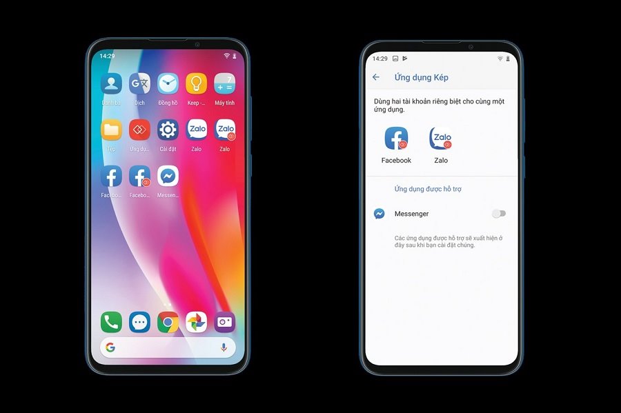 Ứng dụng kép là tính năng giúp người dùng nhân bản các ứng dụng hay sử dụng như Facebook, Facebook Messenger, Telegram, Zalo, Viber…, từ đó có thể sử dụng nhiều tài khoản cũng một lúc trên chiếc smartphone của mình.