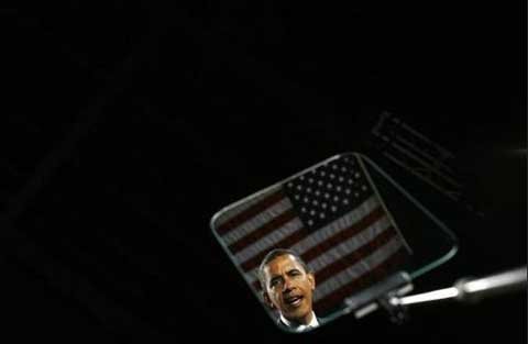 Khuôn mặt của ứng cử viên tổng thống của đảng Dân chủ Thượng nghị sĩ Barack Obama được phản chiếu trên một chiếc máy phóng đại tại một cuộc mít-tinh ở Philadelphia, tháng 10/2008.