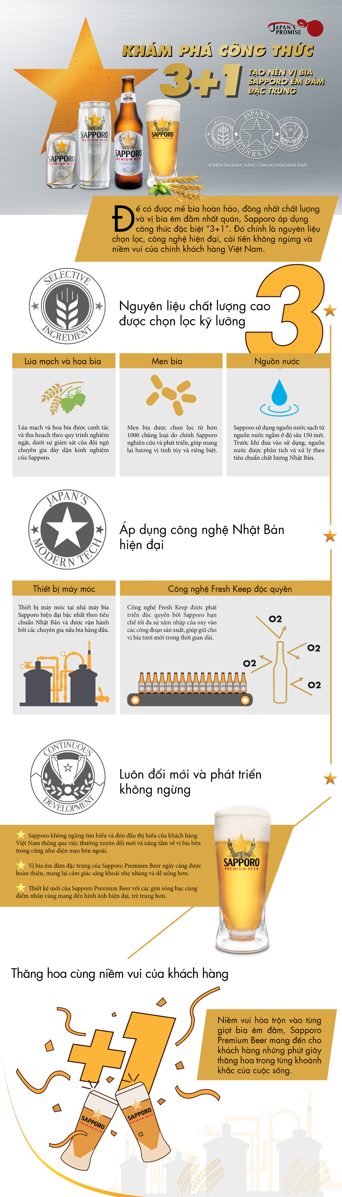 Để có được mẻ bia hoàn hảo, vị bia êm đằm đặc trưng, Sapporo áp dụng công thức đặc biệt “3+1” - kết tinh của 140 năm không ngừng nỗ lực hoàn thiện kỹ thuật nấu bia.
