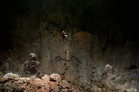Cách duy nhất để vào hệ thống hang động là đu dây từ từ vách hang Loọng Con, cao khoảng 70m.