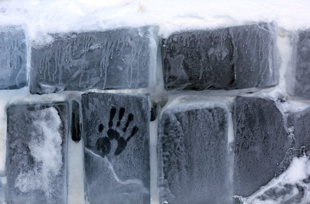 | Một em nhỏ tò mò tìm hiểu bức tường băng bao quanh khách sạn. |