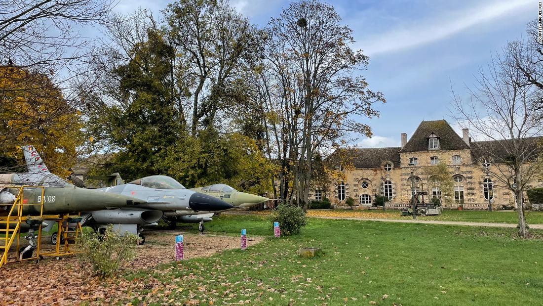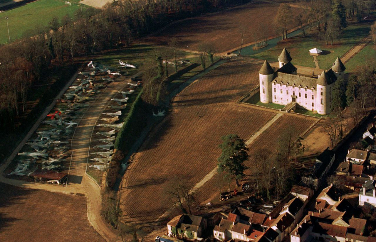 Những đường nét bóng bẩy, màu xám đen của chiếc máy bay phản lực F-16 Fighting Falcon, bên cạnh là hai chiếc máy bay kỳ cựu khác của bầu trời Chiến tranh Lạnh, một chiếc Dassault Mirage IV của Pháp và một chiếc F-104 Starfighter, không phải là điều bạn thường bắt gặp khi bước vào sân của một lâu đài Pháp 700 tuổi.