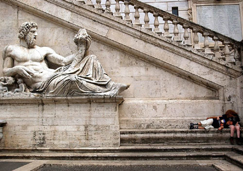 Tòa thị chính: Hai khách du lịch nghỉ ngơi bên cạnh một bức tượng ở phía trước cửa Campidoglio, hội trường thành phố Rome.Các bức tượng do nghệ sĩ Ý Matteo Bartolani xây dựng vào năm 1588 mang hình ảnh đại diện sông Tiber của Rome.