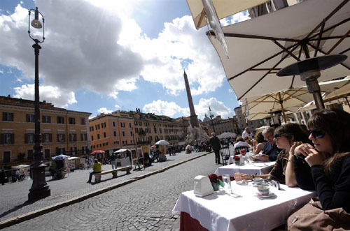 Quảng trường Navona: Người dân thưởng thức cà phê tươi tại một quán cà phê trên quảng trường Navona. Theo thống kê Viện Quốc gia Ý Espresso thì mỗi ngày dân Ý tiêu thụ 70 triệu tách cà phê.