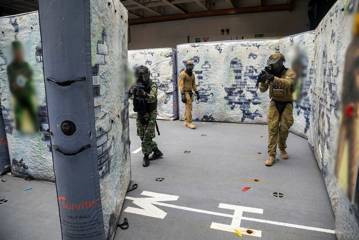 Trong các hình ảnh được Bộ Quốc phòng Australia đăng tải, khu vực vốn là thang máy vận chuyển trực thăng đã được biến thành một trường bắn nhỏ, dựng từ nhiều tấm đệm hơi. Đại diện hải quân Australia cho biết, trường bắn được dùng để thực hành tác chiến đô thị.