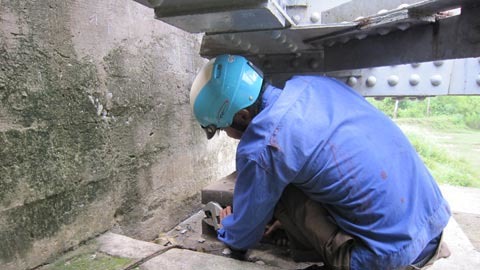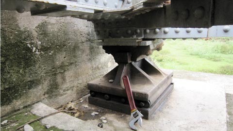 | Hiện trường cầu đường sắt Yên Chu bị tháo mất một con ốc ‘trùm’ quan trọng nhất của cây cầu. |