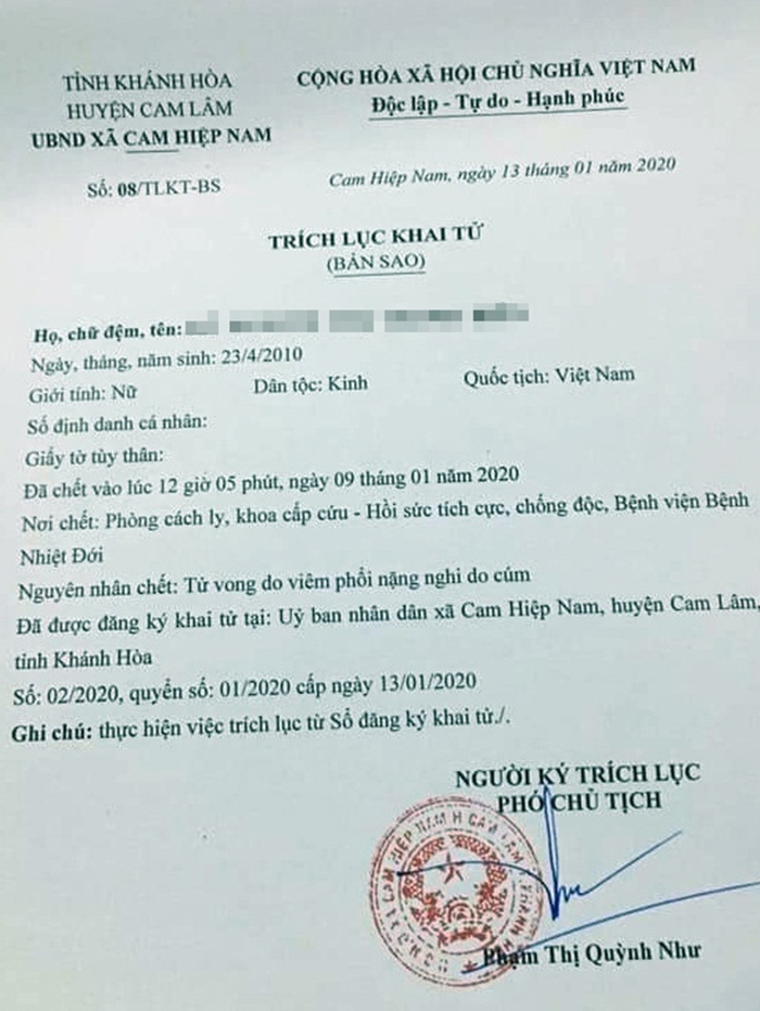 Mấy ngày qua, mạng xã hội và người dân tỉnh Khánh Hòa lan truyền thông tin bệnh nhân L. N. Th. T. H. (10 tuổi, ngụ huyện Cam Lâm) bị nhiễm virus corona, dẫn đến tử vong khiến cộng đồng hoang mang.