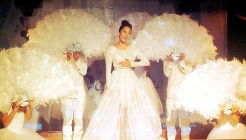 | Khánh Thi trong buổi ra mắt MV "Bỏ mặc mùa đông" (Ảnh: VOV1) |