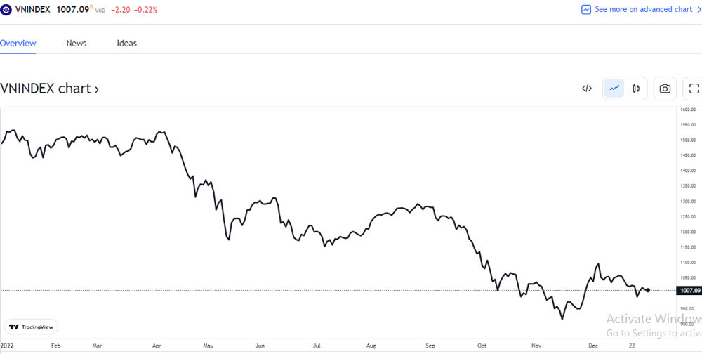 Tính chung cả năm 2022, chỉ số VN-Index giảm 34%, từ mức đỉnh 1.525,58 điểm ghi nhận trong phiên đầu năm xuống còn 1.007,09 điểm vào cuối năm.
