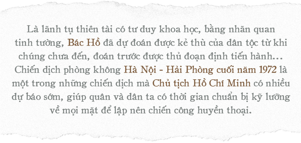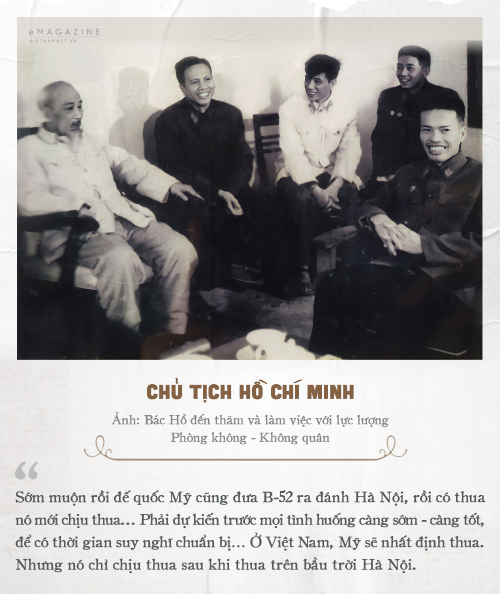 Không phải ngẫu nhiên mà Chủ tịch Hồ Chí Minh lại dành sự quan tâm đặc biệt tới B-52. Cuối năm 1967, sau khi nghe báo cáo của ông Phùng Thế Tài (lúc này là Phó Tổng Tham mưu trưởng phụ trách Phòng không - Không quân), Chủ tịch Hồ Chí Minh đã khẳng định: “Sớm muộn rồi đế quốc Mỹ cũng đưa B-52 ra đánh Hà Nội, rồi có thua nó mới chịu thua... Phải dự kiến trước mọi tình huống càng sớm - càng tốt, để có thời gian suy nghĩ chuẩn bị… Ở Việt Nam, Mỹ sẽ nhất định thua. Nhưng nó chỉ chịu thua sau khi thua trên bầu trời Hà Nội”.