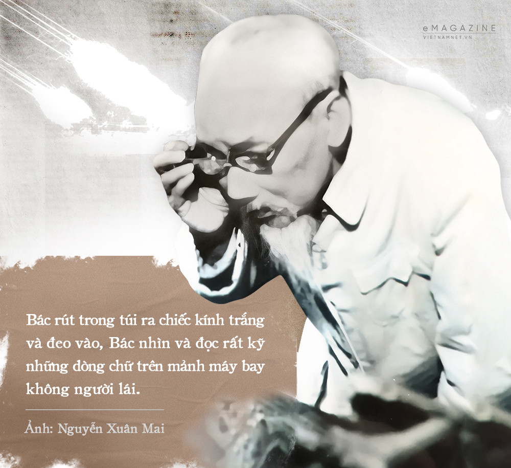 Bác nghe đến đó vội rút trong túi ra chiếc kính trắng và đeo vào, Bác nhìn và đọc rất kỹ những dòng chữ trên mảnh máy bay. Chính thời điểm đó Đại tá Nguyễn Xuân Mai bấm được một kiểu ảnh, và bức ảnh lịch sử “Bác Hồ xem xác máy bay không người lái” được ra đời.