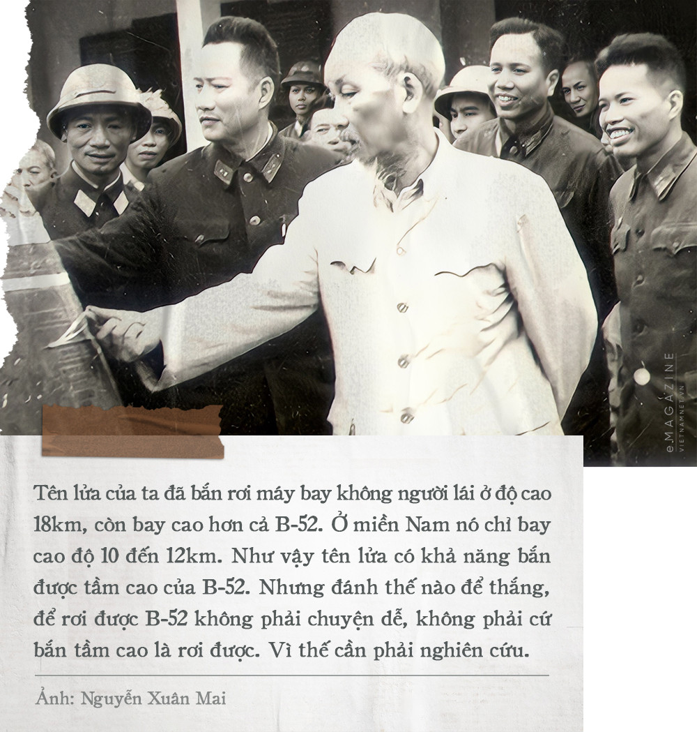 “Hôm nay, Bác thấy tên lửa của ta đã bắn rơi máy bay ở độ cao 18km, còn bay cao hơn cả B-52. Ở miền Nam nó chỉ bay cao độ 10 đến 12km. Như vậy tên lửa có khả năng bắn được tầm cao của B-52. Nhưng đánh thế nào để thắng, để rơi được B-52 không phải chuyện dễ, không phải cứ bắn tầm cao là rơi được. Vì thế muốn bắn được nó, các chú phải nghiên cứu”, ông Mai thuật lại những lời Bác căn dặn.