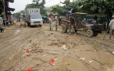 | Công nhân môi trường ở thị trấn Kiến Giang dọn bùn đất |