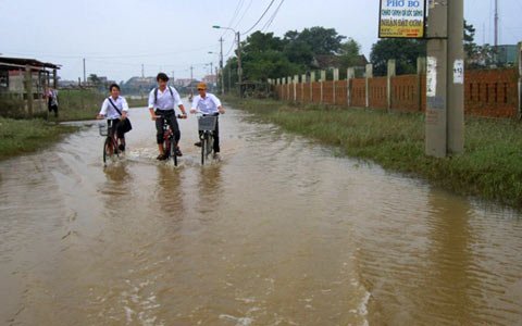 Một số con đường ngập sâu nhất ở men theo triền sông Kiến Giang qua xã Phong Thủy nước vẫn còn ngập gần 0,3 – 0,5m. Nhiều học sinh phải gồng sức đạp xe qua đây khi tan học về.