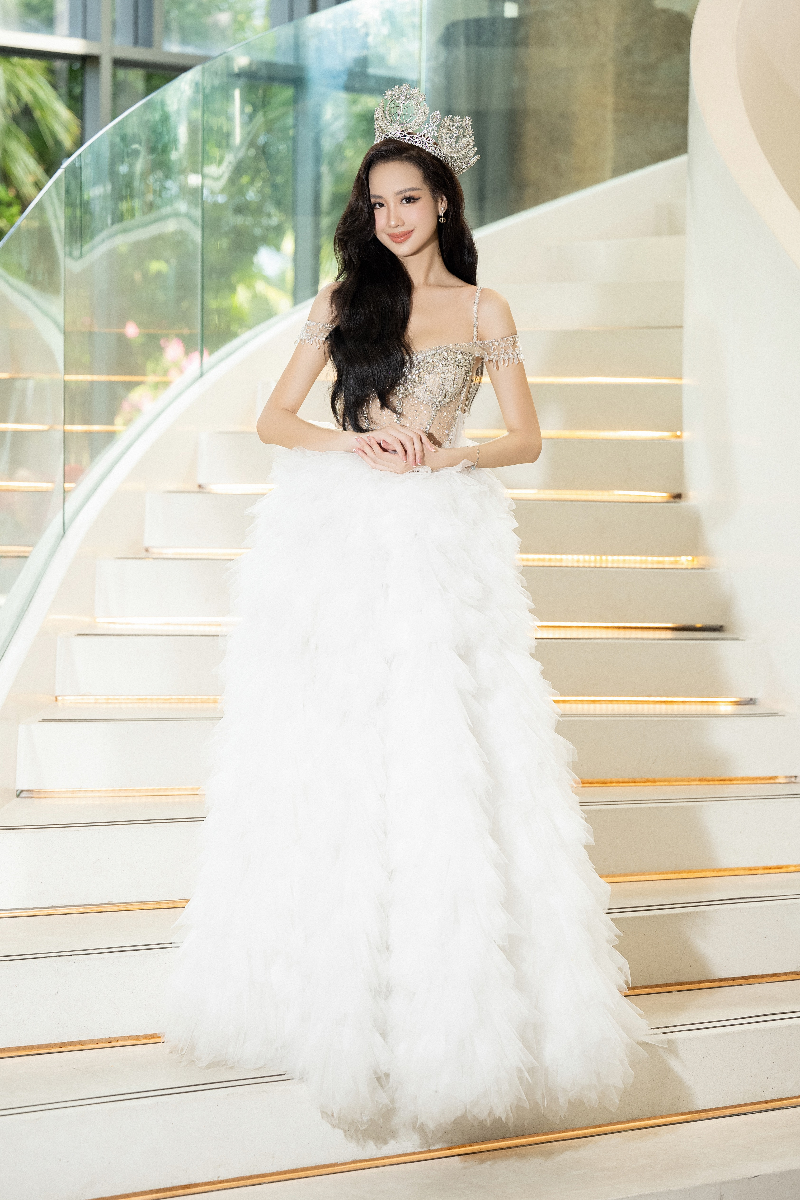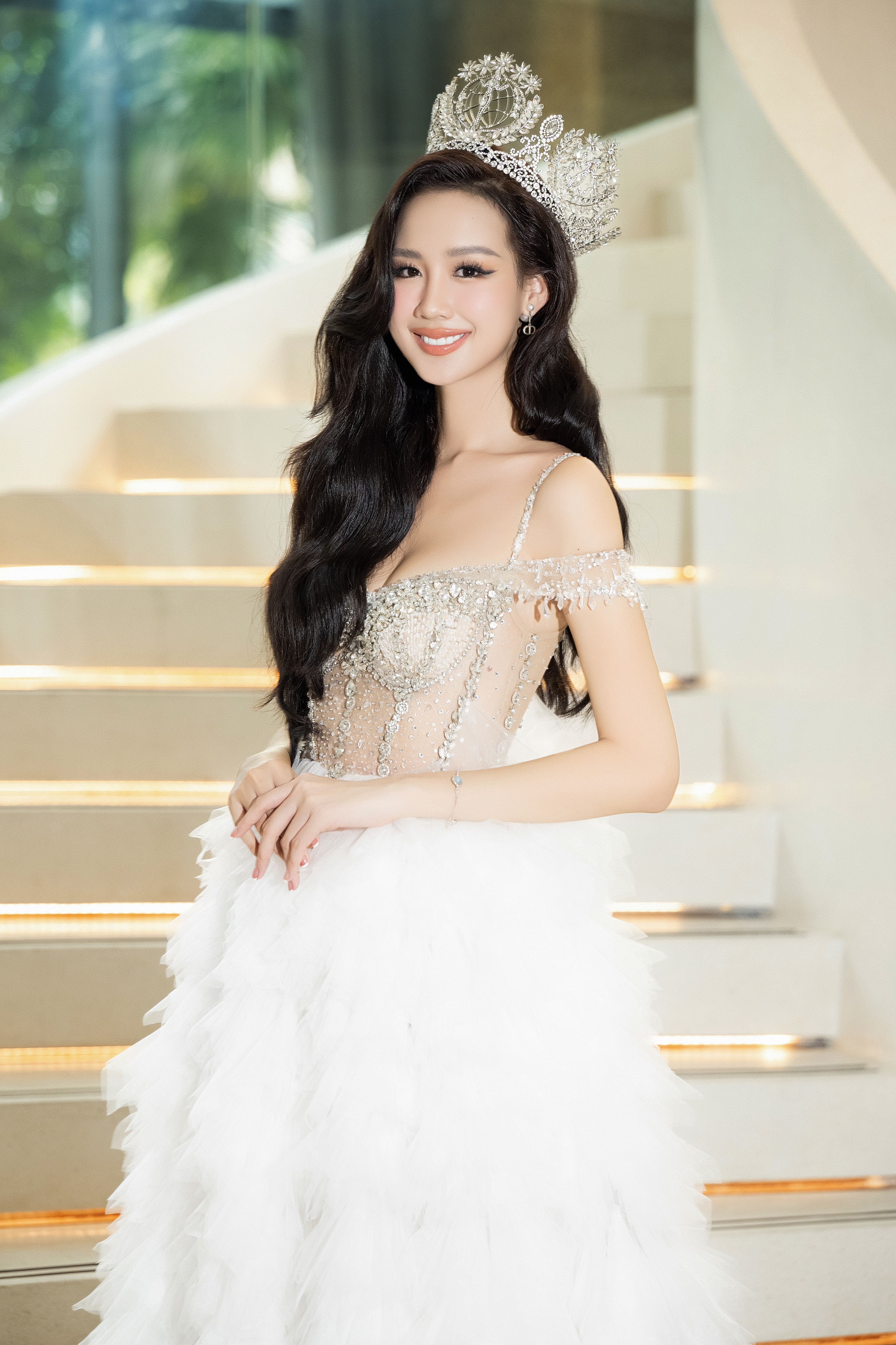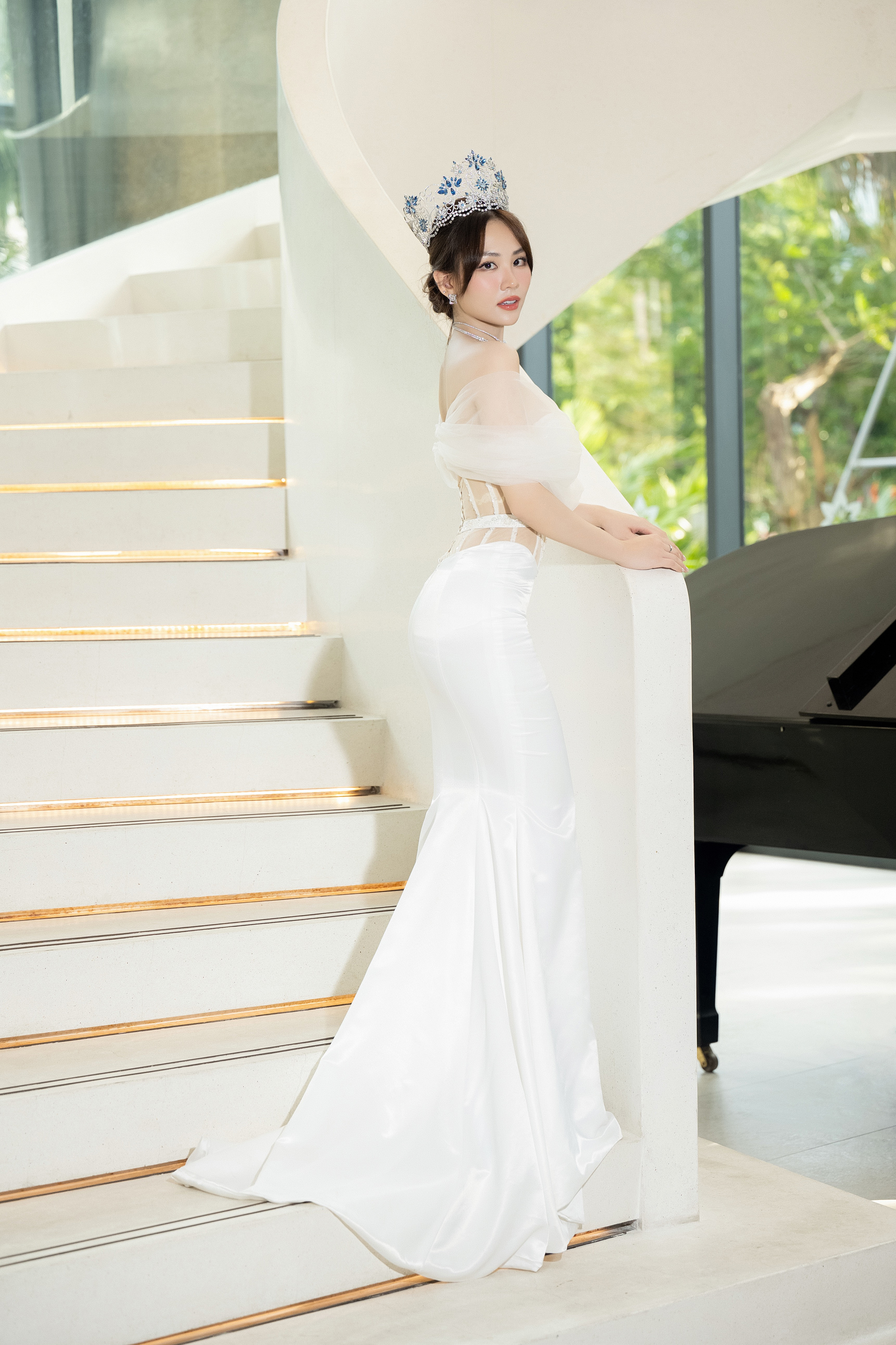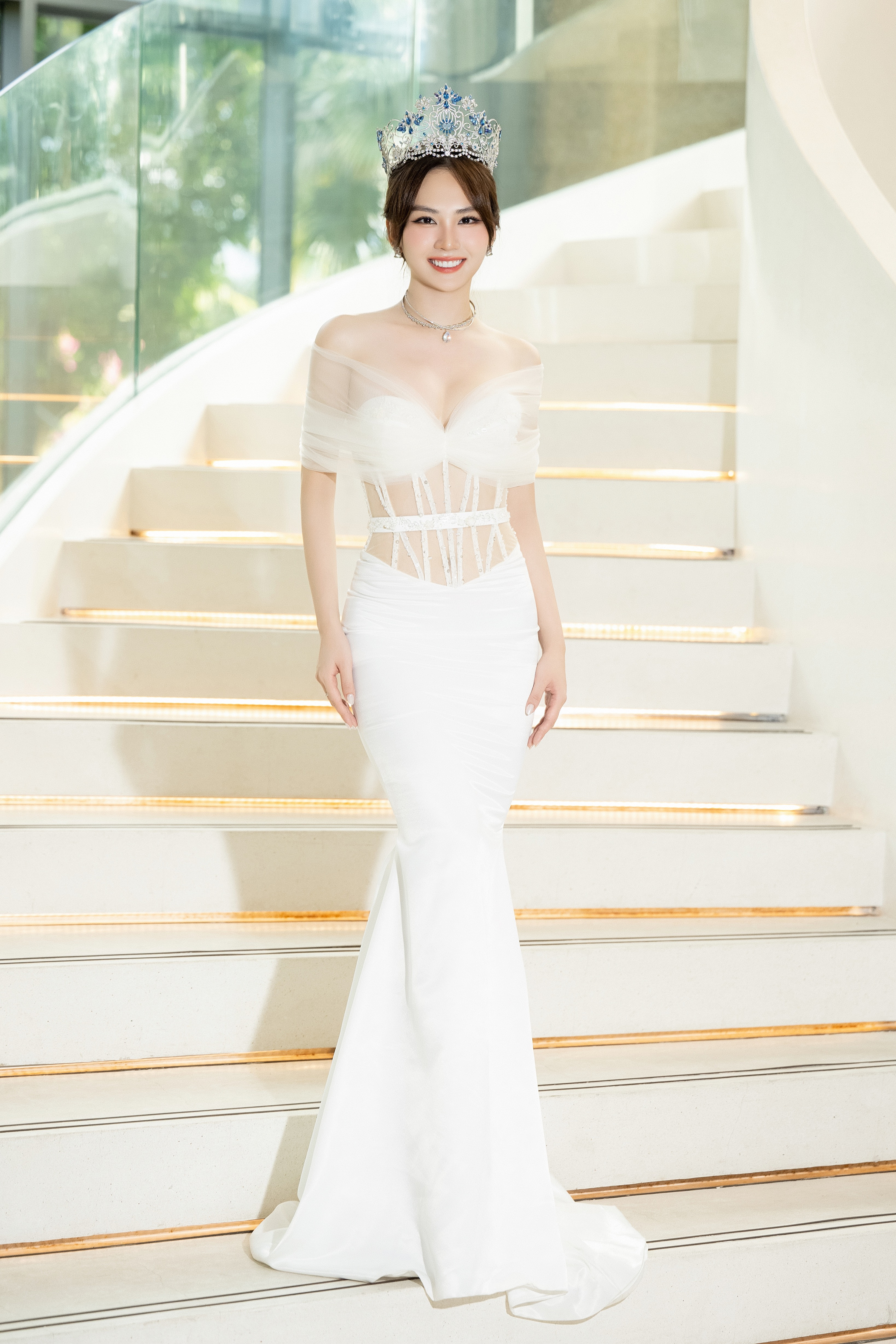 Hoa hậu Mai Phương xuất hiện nổi bật trong những ngày cuối của nhiệm kỳ Hoa hậu Thế giới Việt Nam với diện mạo sang trọng, quyến rũ.Người đẹp diện trang phục được nhà thiết kế Lê Ngọc Lâm sáng tạo riêng, lấy cảm hứng từ ngọn sóng để tôn vinh nét đẹp vừa mạnh mẽ vừa dịu dàng của nàng hậu.Nhà thiết kế dùng vải lưới xuyên thấu tạo hình ở ngực để trông như có một lớp sóng cuộn dâng, ôm lấy thân hình mềm mại của người đẹp. Hoa hậu Thiên Ân mặc bộ đầm được liên tưởng đến con sóng cuộn trào ôm trọn bờ vai của người đẹp.