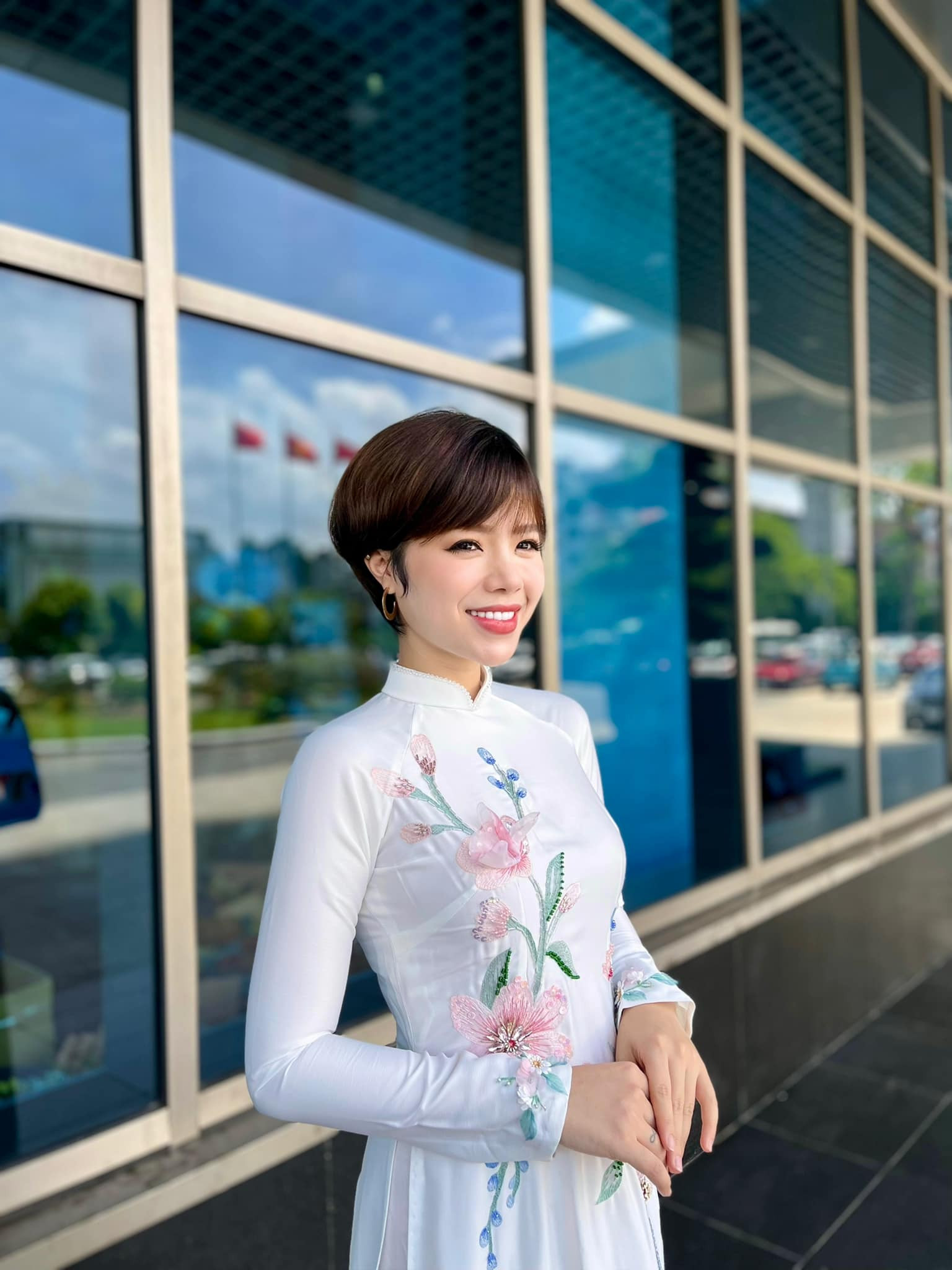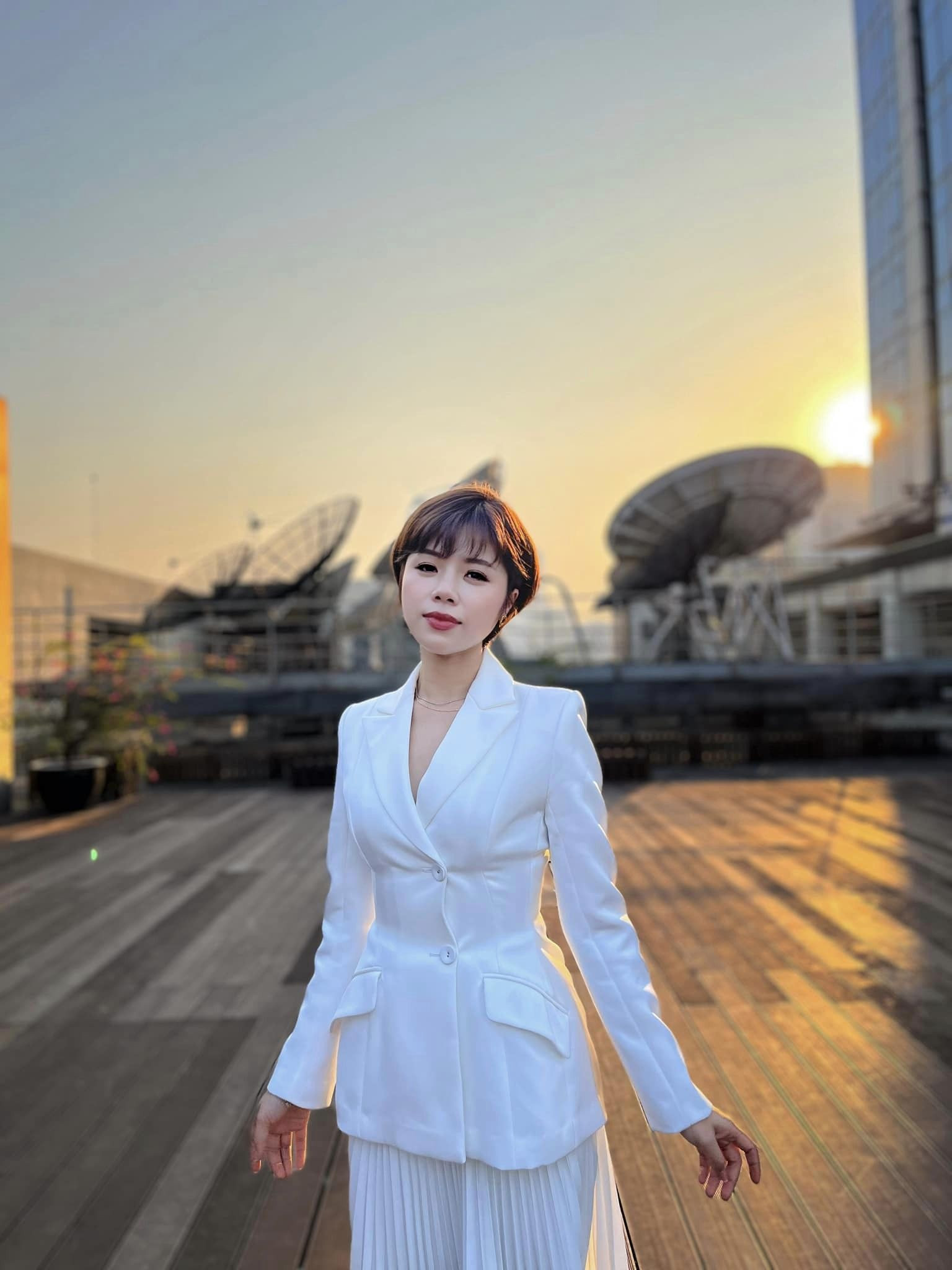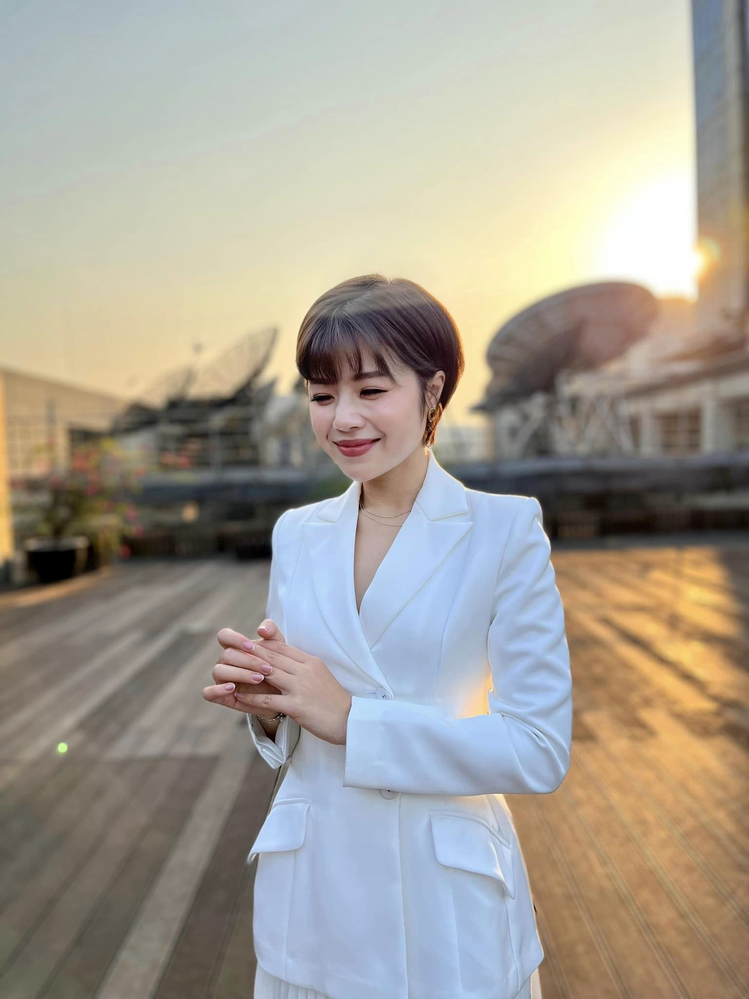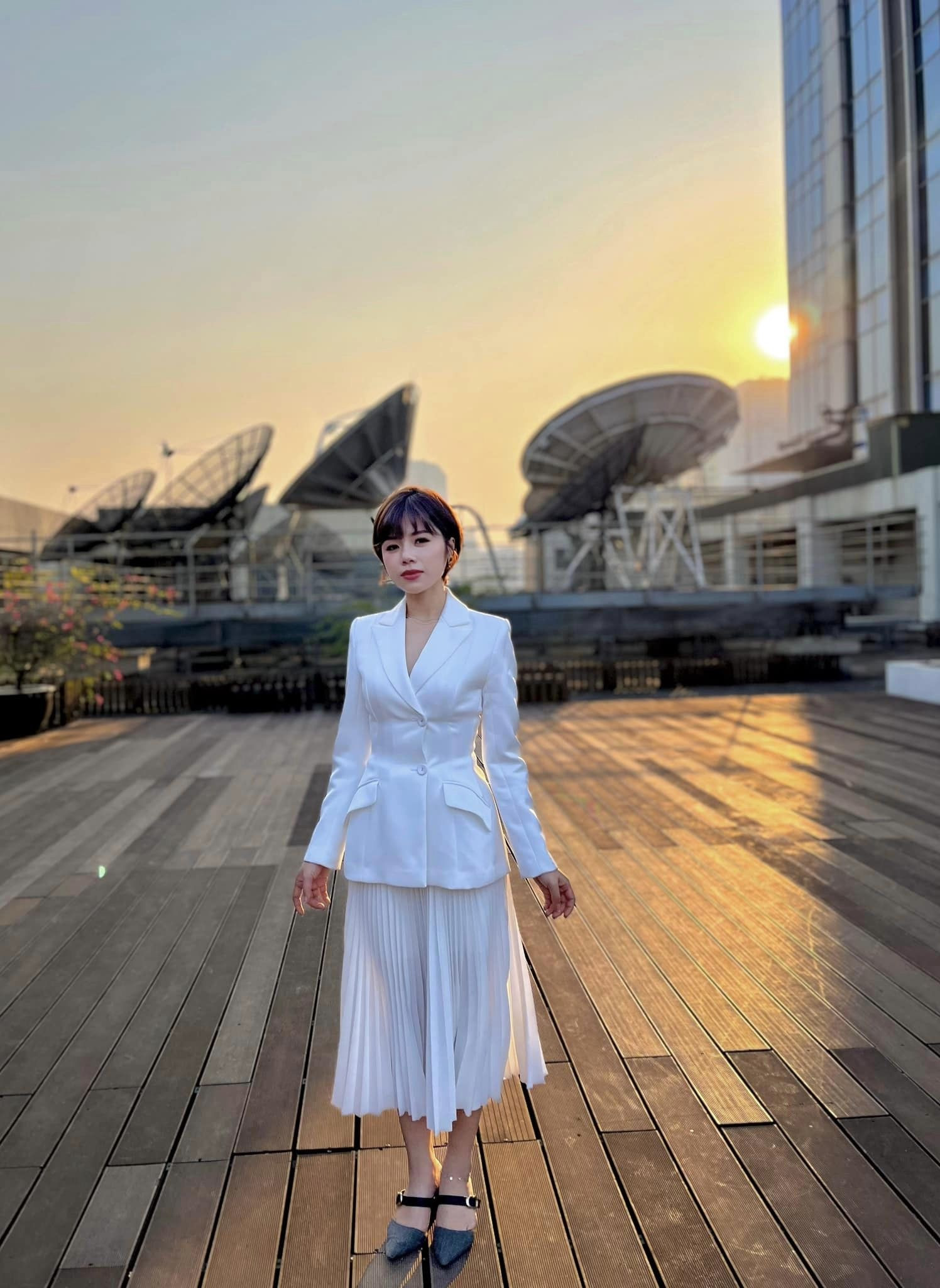Cô thường chọn những bộ cánh thanh lịch trẻ trung mỗi khi lên sóng truyền hình.