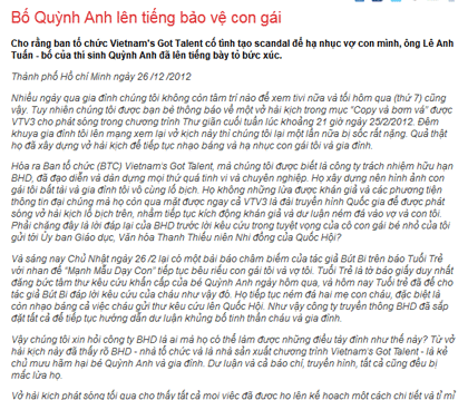 Xem chừng, "cuộc khẩu chiến" của gia đình QA với dư luận xã hội có vẻ như chưa ngưng nghỉ. Mới đây, người thứ ba- ông Lê Anh Tuấn, cha của em lên tiếng- với một lá thư gửi báo chí, và cũng đăng trên website của Trường Quốc tế Châu Á- Thái Bình Dương, ngày 27/2/2012, nhan đề: "Lời nhắn gửi của gia đình Quỳnh Anh Vietnam's Got Talent". Đây được coi là phát ngôn chính thức của người chủ gia đình QA.