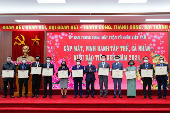 | Chủ tịch UBTƯ MTTQ Việt Nam Đỗ Văn Chiến trao Bằng khen cho các cá nhân đã có nhiều đóng góp trong công tác người Việt Nam ở nước ngoài về dự chương trình Xuân Quê hương năm 2022. |