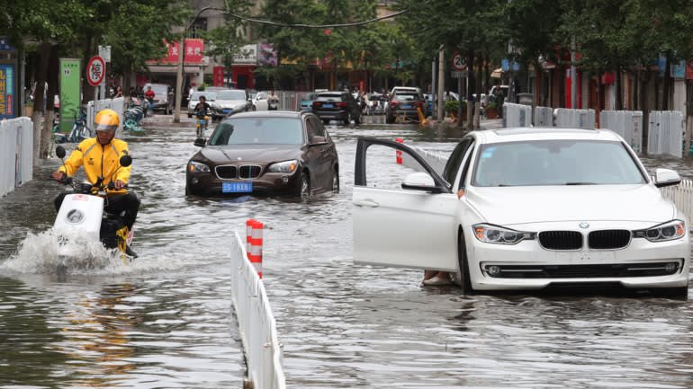 Tài xế Meituan đi xe điện vào khu vực đường phố ngập lụt. Tờ People's Daily viết họ phải "mạo hiểm cuộc sống vì miếng ăn". Ảnh: Getty Images |