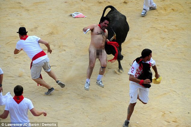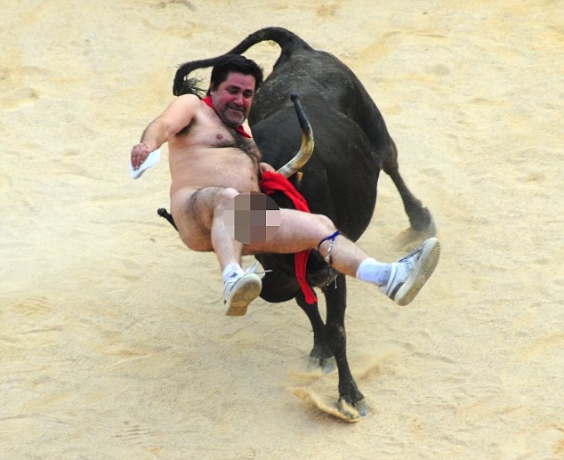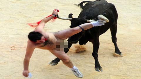 Một người đàn ông khỏa thân tại Tây Ban Nha đã được phen hú vía khi đột nhiên bị một con bò tót hung hăng nhấc bổng lên không trung.