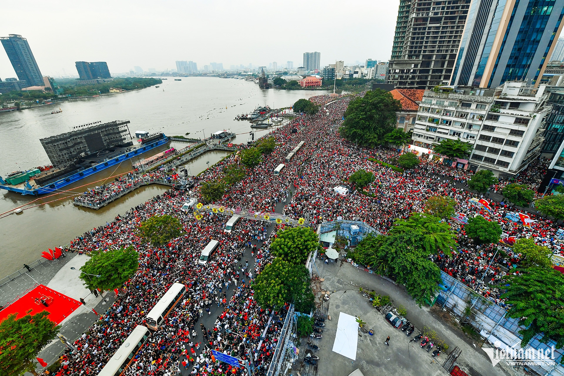 Các khối từ phố đi bộ Nguyễn Huệ đi một vòng rồi rẽ trái về Tôn Đức Thắng để tới bến Bạch Đằng. Ảnh: Hoàng Hà.