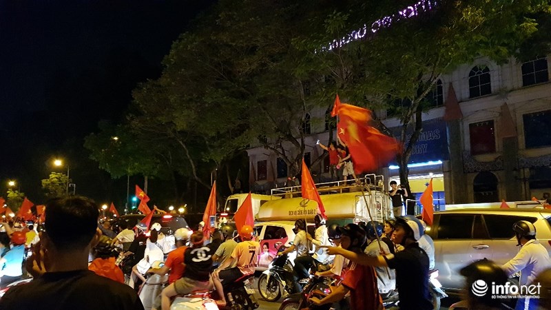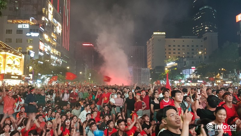 Sau tiếng còi chung cuộc, Việt Nam giành chiến thắng, trên các tuyến đường khắp TP.HCM, cờ đỏ sao vàng tung bay. Người hâm mộ trong sắc áo cờ đỏ sao vàng xuống đường mừng chiến thắng của tuyển Việt Nam trước Philippines, giành vé vào chung kết AFF CUP 2018.