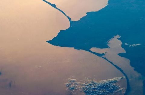 Bình minh nhuộm hồng hai phá nước ngọt gần Kaliningrad, Nga. Các đầm phá này bị ngăn cách với biển Baltic (bên trái) bằng các dải đất hẹp uốn lượn hai bên bán đảo.
