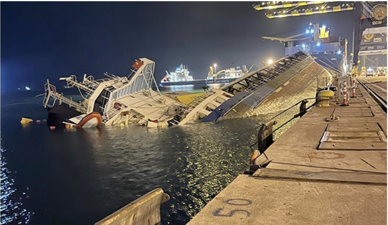 Đoạn video ghi lại những gì xảy ra cho thấy, một chiếc ô tô nâng đang dỡ các công ten nơ thì con tàu bắt đầu nghiêng ngả. Những người đứng gần đó mau chóng di chuyển ra xa sau khi nghe thấy tiếng rít. Con tàu mau chóng chìm xuống nước, khiến các thủy thủ đoàn và những người đang dỡ hàng bị sốc.