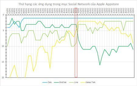 Diễn biến thị trường có sự thay đổi chóng mặt khi cuối năm 2012, Kakao Talk tăng trưởng liên tục từ vị trí thứ 7 lên thứ 2; Line từ số 10 lên số 3, còn Zalo giữ vị tri số 1. Cho đến giữa tháng 2/2013, bảng xếp hạng các ứng dụng tin nhắn miễn phí trên di động đã có sự thay đổi nhỏ, vị trí số 1 vẫn thuộc về Zalo với gần 1 triệu người dùng, nhưng thứ 2 là Line và Kakao Talk đã xuống thứ 9 trên bảng xếp hạng App Store.