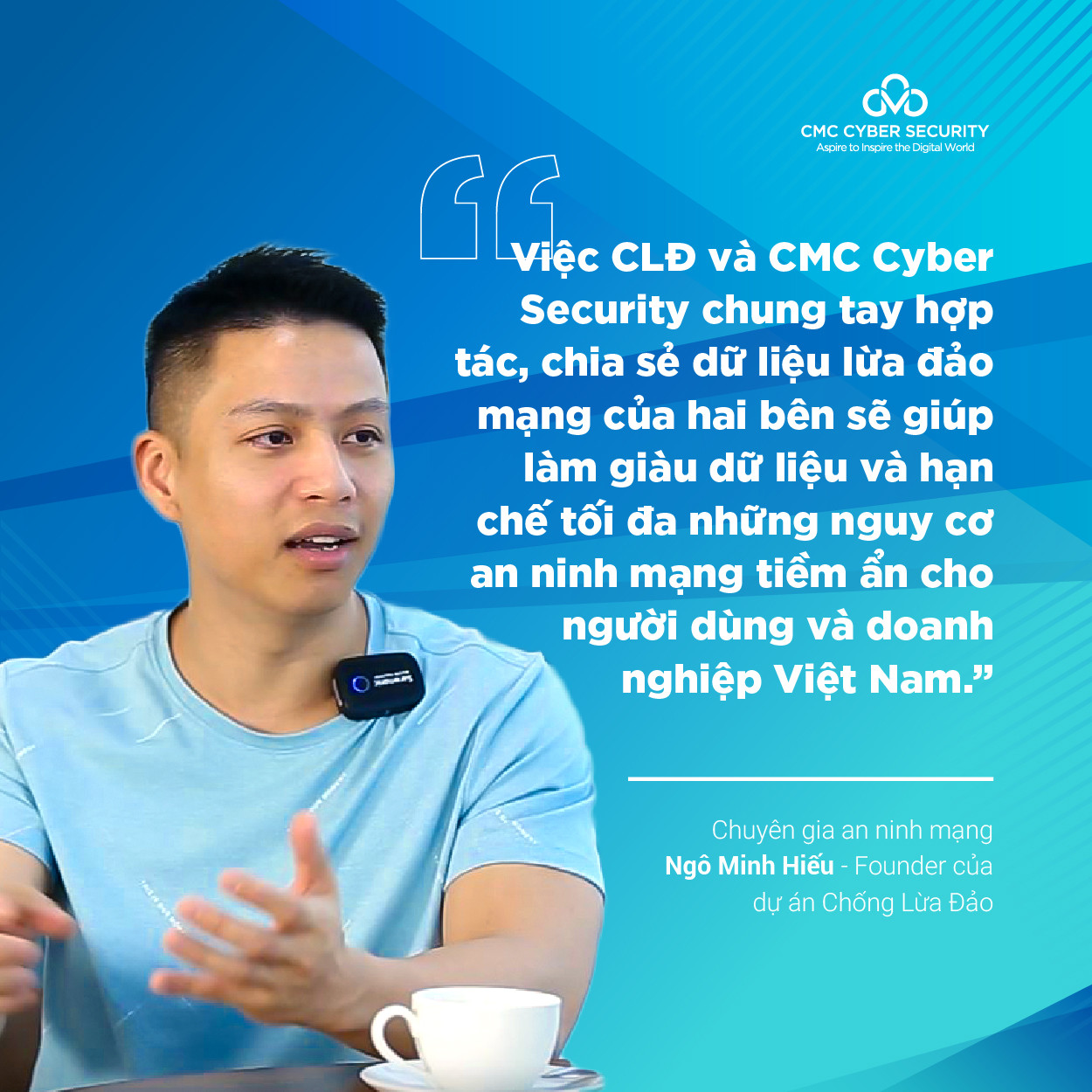 Cũng trong lễ ký kết, chuyên gia Ngô Minh Hiếu - Sáng lập dự án Chống Lừa Đảo chia sẻ: “Việc CLĐ và CMC Cyber Security chung tay hợp tác, chia sẻ dữ liệu lừa đảo mạng của hai bên sẽ giúp ích rất nhiều trong việc làm giàu dữ liệu và hạn chế tối đa những nguy cơ an ninh mạng tiềm ẩn cho người dùng và cho doanh nghiệp Việt Nam”.