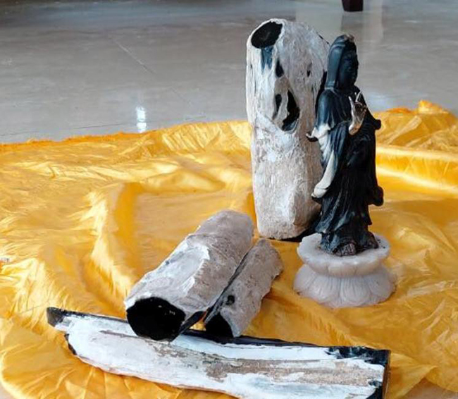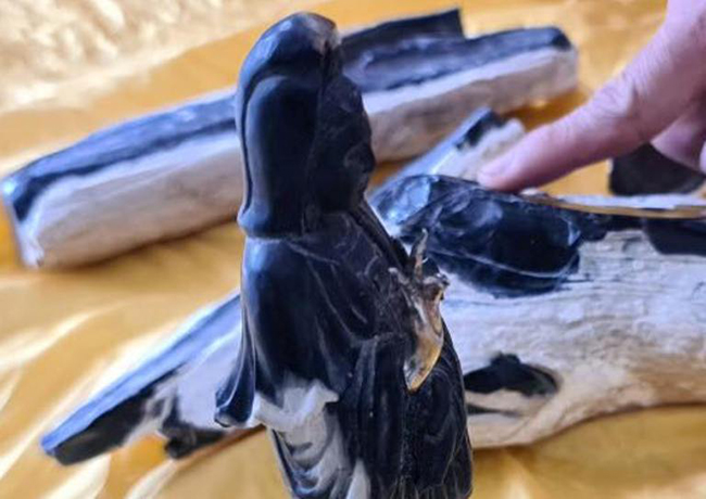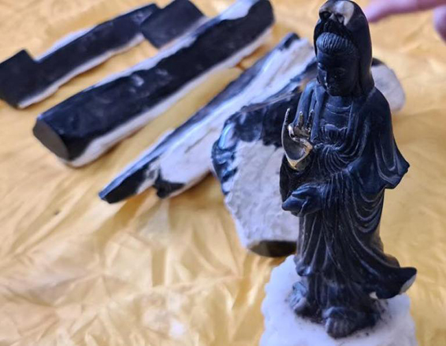 Khối trầm hương “hắc kỳ” của anh Nguyễn Văn Lợi ở Đông Anh, Hà Nội có trọng lượng hơn 3kg bao gồm: 1 tượng phật bà Quan âm cùng 3 thanh Kỳ nam đã hóa thạch.