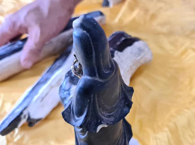 “Bức tượng Quan thế âm này tôi thuê người tạc cách đây hơn mười năm, khi đó là một khối màu đen tuyền, nhưng hiện tại đang chuyển dần thành những vạt trắng tuyết” – anh Lợi cho hay.