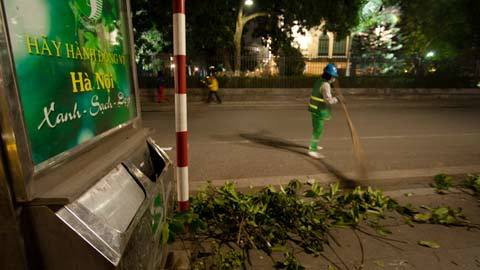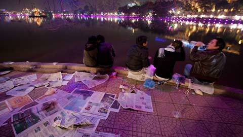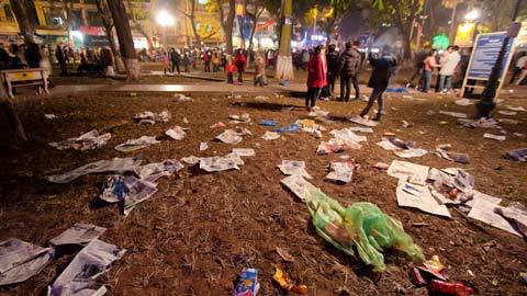| Sau thời khắc giao thừa, những bãi đất trống xung quanh khu vực Hồ Hoàn Kiếm trở thành nơi chứa vỏ đồ ăn, báo dùng để ngồi xem bắn pháo hoa, vv... |