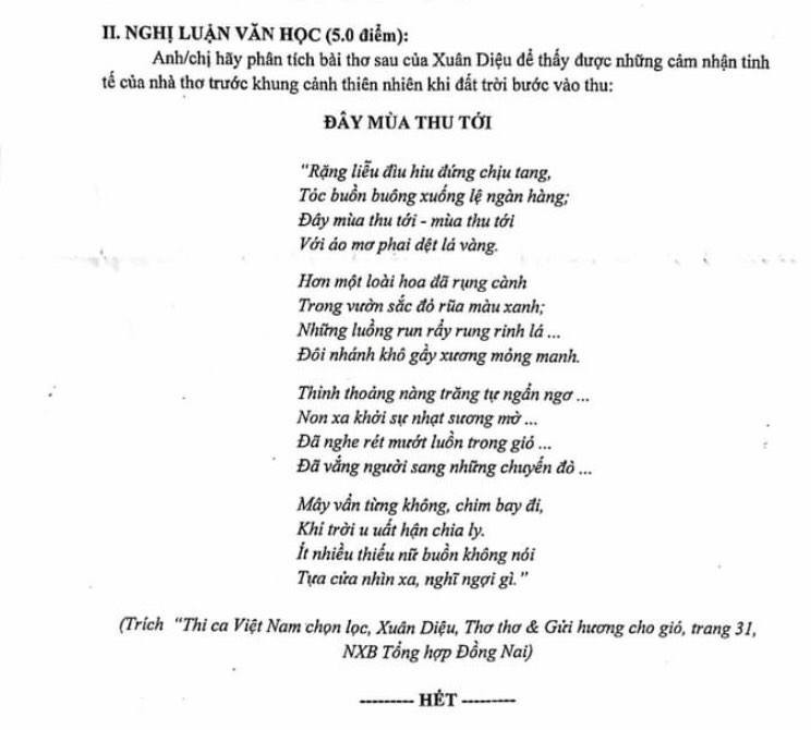 Đề Ngữ văn 10 cho ngữ liệu là bài thơ “Đây mùa thu tới” của Xuân Diệu, nhưng không có một dòng chú thích nào về tác giả, hoàn cảnh sáng tác của tác phẩm thì làm sao học sinh có đủ thông tin để làm bài.